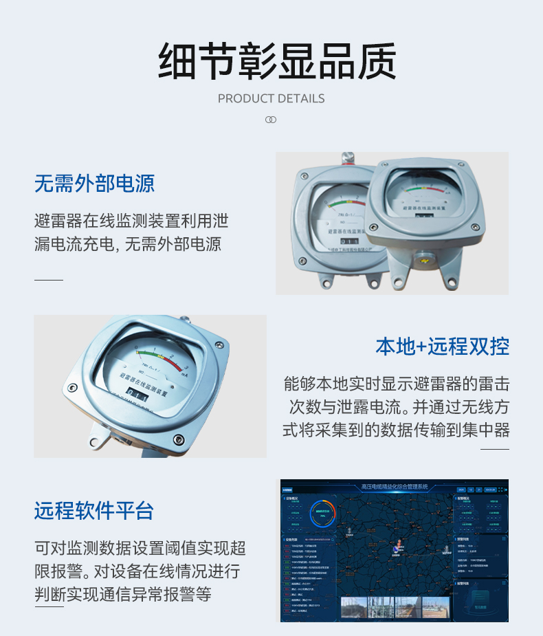 避雷器在线监测装置包含监测器和集中器组成,监测器采集避雷器的雷击次数、需击时间、全电流以及阳性电流能够本地实时显示避雷器的雷击次数与泄露电流。并通过无线方式将采集到的数据传输到集中器。集中器接收来自监测器的实时数据进行处理后传输至监测平台展示。一台集中器可集中场所内多台监测器的数据。监测软件部署在控制室,接收来自集中器的数据,可对监测数据设置闻值实现超限报警。对设备在线情况进行判断实现通信异常报警等。