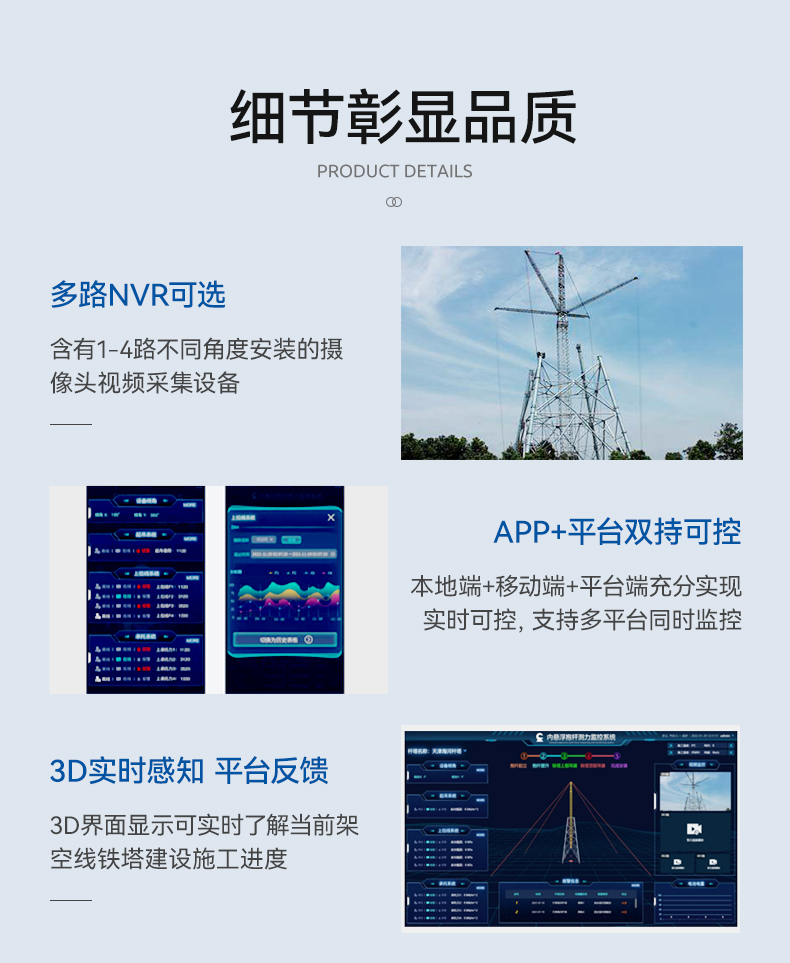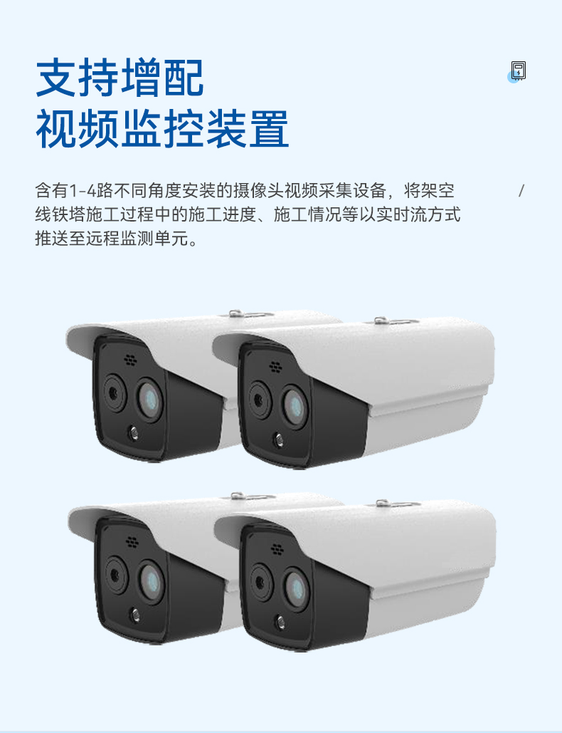 Ø 可增配视频监控装置:含有1-4路不同角度安装的摄像头视频采集设备,经由NVR将架空线铁塔施工过程中的施工进度、施工情况等以实时流方式推送至远程监测单元。