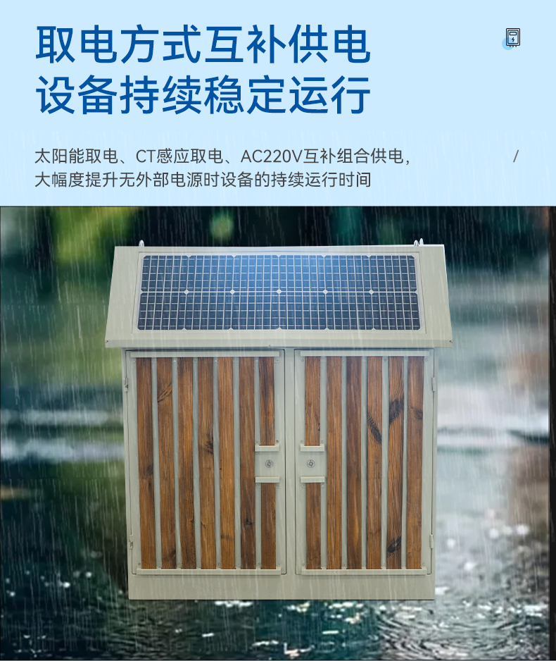 Ø取电方式亘补:装置采用太阳能取电方式外,还可采用CT感应取电或AC220V进行亘补供电,提高产品的可靠性 与多样性。