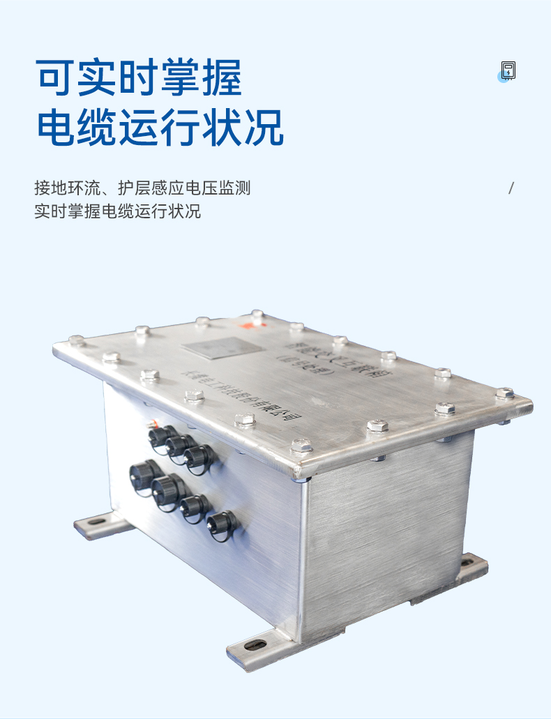 智能接地箱可对电缆金属护层接地环流、感应电压进行监测以辅助判断电力电缆运行状况,并可对安装环境温湿度、接头井水位等参数进行监测,加装摄像头、震动传感器、倾斜传感器,实现对现场区域的全面布防。